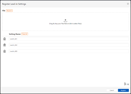 Select the Lead-in setting file or Lead-out setting file you want to register on each screen. You can only select files with the .json extension. You can register up to 10 files at once. |