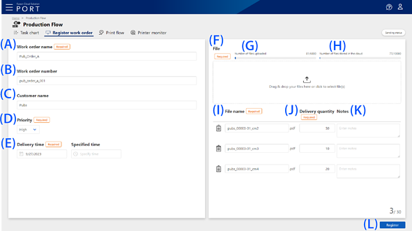 Click to display the screen showing the upload status of the print files and register the work order. |